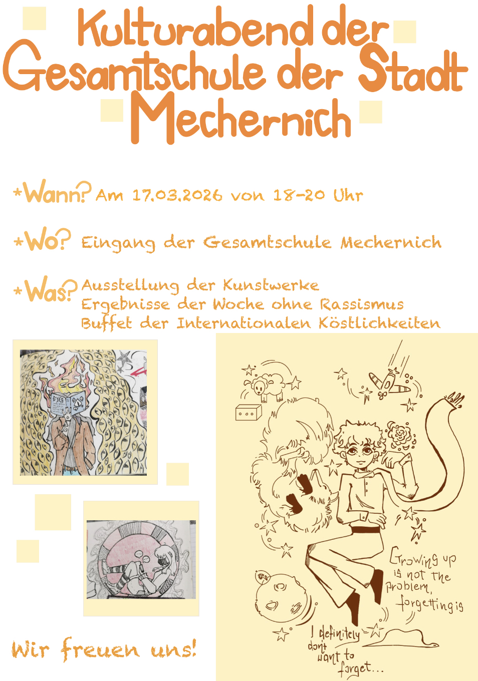 Die Gesamtschule der Stadt Mechernich lädt herzlich zum diesjährigen Kulturabend ein. Am 17. März 2026 von 18 bis 20 Uhr haben Besucherinnen und Besucher die Gelegenheit, kreative Arbeiten unserer Schülerinnen und Schüler zu entdecken und einen Einblick in das kulturelle Leben unserer Schule zu erhalten. Im Rahmen des Abends werden zahlreiche Werke aus dem Kunst- und Technikunterricht ausgestellt. Darüber [...]