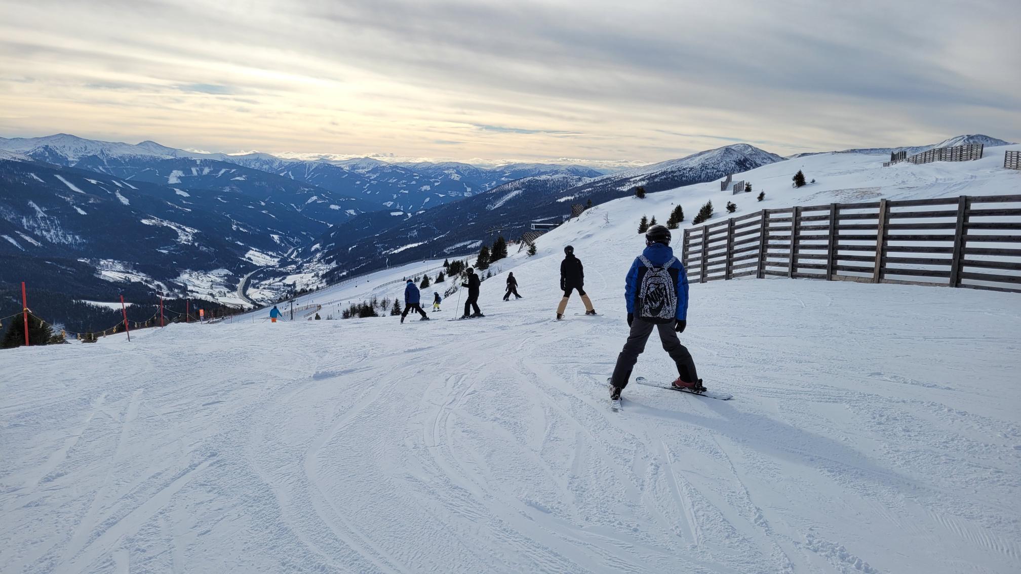 Am ersten Skitag erhielten alle ihre Skiausrüstung und wurden anschließend je nach Vorerfahrung in Gruppen eingeteilt. Anfängerinnen und Anfänger, die noch keine Erfahrung auf Skiern hatten, übten zunächst gemeinsam mit ihren Lehrerinnen und Lehrern auf einer blauen Piste die grundlegenden Techniken des Skifahrens. Die fortgeschrittenen Skifahrerinnen und Skifahrer starteten ebenfalls mit Aufwärmübungen, bevor sie auf einer roten Piste ihre Fahrtechnik weiter verbesserten. Ziel des ersten Tages war es, die Anfänger behutsam an das Skifahren heranzuführen und gleichzeitig den Fortgeschrittenen nach längerer Pause wieder Sicherheit auf den Skiern zu geben.