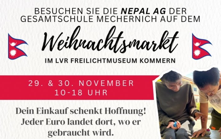 Weihnachtsmarkt im LVR-Freilichtmuseum Kommern Am 29. & 30. November, jeweils 10–18 Uhr, ist die Nepal-AG unserer Gesamtschule wieder mit einem eigenen Stand dabei. Auch unsere Schulpflegschaft und unser Förderverein sind wieder vertreten. Dein Einkauf schenkt Hoffnung! Bei uns findet ihr handgenähte Unikate, Kerzen und liebevolle Geschenkideen – hergestellt mit Herz von unserer „Nepal-Oma“ und der Nepal-AG. Warum das wichtig [...]